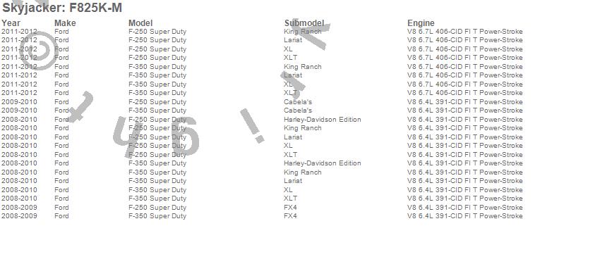 Below is an abbreviated list of applications for the Suspension Lift Kit w/Shock.F-250 Super Duty Pickup, F-350 Super Duty Pickup, Ford, 2012, 2011, 2010, 2009, 2008