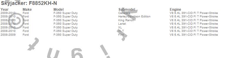 Brand: SkyjackerPart Number: F8852KH-NLift Kit-Suspension w/Shock Type: Nitro Shocks - 8.5 in. Lift - Incl. Front Coils/Rear Add-A-LeafsUPC:
