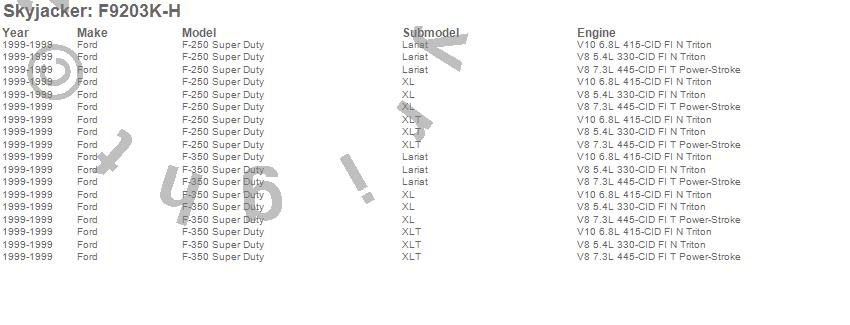 Brand: SkyjackerPart Number: F9203K-HLift Kit-Suspension w/Shock Type: Hydro Shocks - 1.5-2 in. Lift - Incl. Front Leaf SpringsUPC: