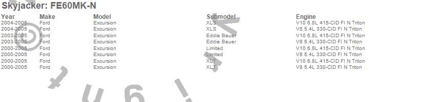 Below is an abbreviated list of applications for the Suspension Lift Kit w/Shock.Excursion, Ford, 2005, 2004, 2003, 2002, 2001, 2000