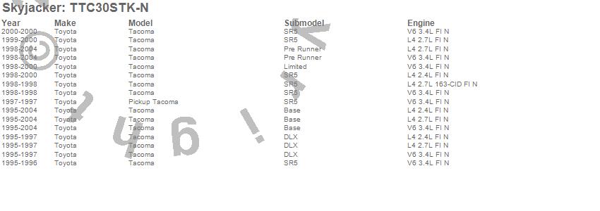 Brand: SkyjackerPart Number: TTC30STK-NLift Kit-Suspension w/Shock Type: Nitro Shocks - 3 in. Lift - Incl. Main Component Box - Rear Add-A-LeafUPC: