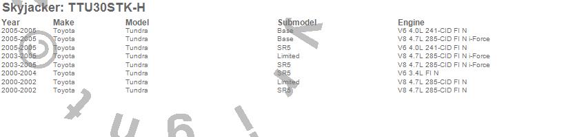 Brand: SkyjackerPart Number: TTU30STK-HLift Kit-Suspension w/Shock Type: Hydro Shocks - 3 in. Lift - Incl. Main Component Box - Rear Add-A-LeafUPC: