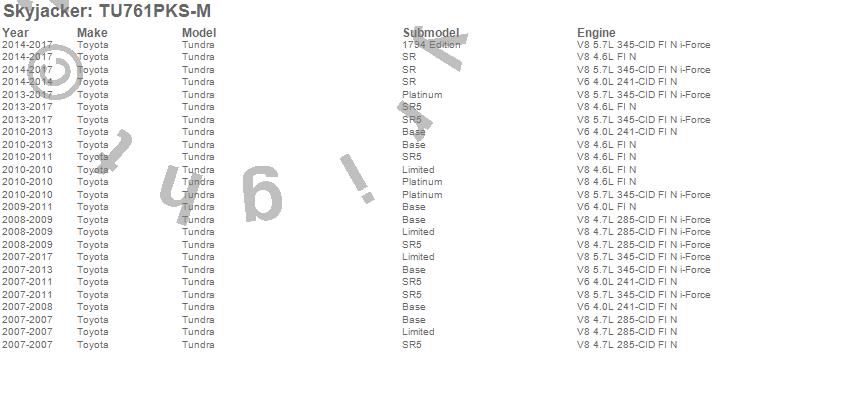 Brand: SkyjackerPart Number: TU761PKS-MLift Kit-Suspension w/Shock Type: M95 Performance Shocks - 6 in. Lift - Incl. Knuckles Pair - Front/Rear Crossmembers - Rear Springs - BrakelinesUPC: