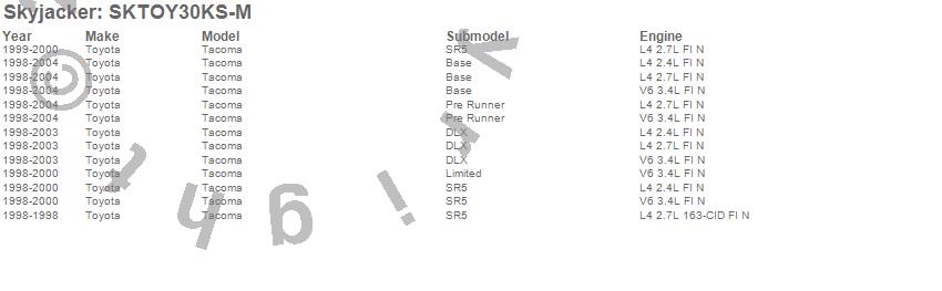Brand: SkyjackerPart Number: SKTOY30KS-MLift Kit-Suspension w/Shock Type: M95 Performance Shocks - 3 in. Lift - Incl. Coil SpringsUPC:
