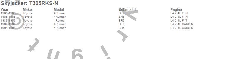 Brand: SkyjackerPart Number: T305RKS-NLift Kit-Suspension w/Shock Type: Nitro Shocks - 5 in. Lift - Incl. Front/Rear Leaf Springs - Front/Rear UBolt Kits - Front/Rear Spring Bushing Kits - Track Arm BracketUPC: