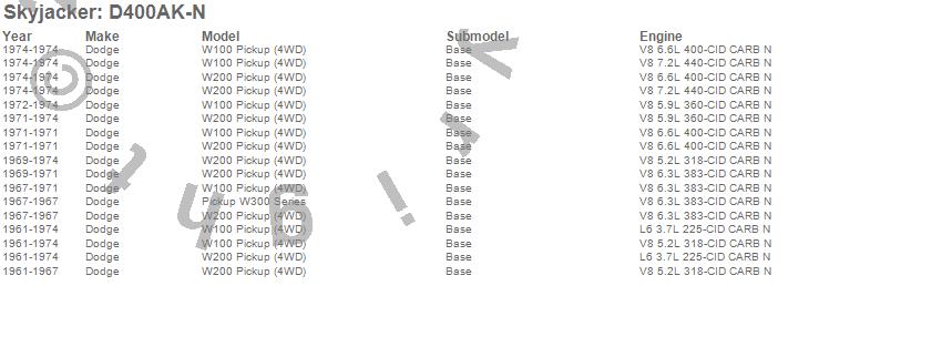 Below is an abbreviated list of applications for the Suspension Lift Kit w/Shock.W100 Pickup, W100 Series, W200 Pickup, W200 Series, W300 Series, Dodge, 1974, 1973, 1972, 1971, 1970, 1969, 1968, 1967, 1966, 1965, 1964, 1963, 1962, 1961