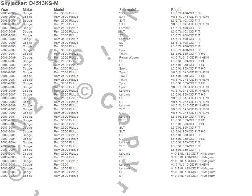 Below is an abbreviated list of applications for the Suspension Lift Kit w/Shock.Ram 2500 Pickup, Ram 3500 Pickup, Dodge, 2009, 2008, 2007, 2006, 2005, 2004, 2003