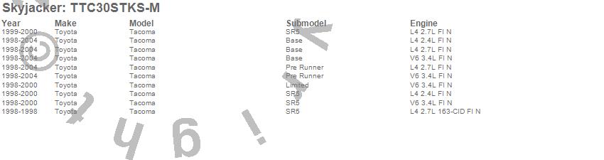 Brand: SkyjackerPart Number: TTC30STKS-MLift Kit-Suspension w/Shock Type: M95 Performance Shocks - 3 in. Lift - Incl. Main Component Box - Rear Leaf SpringsUPC:
