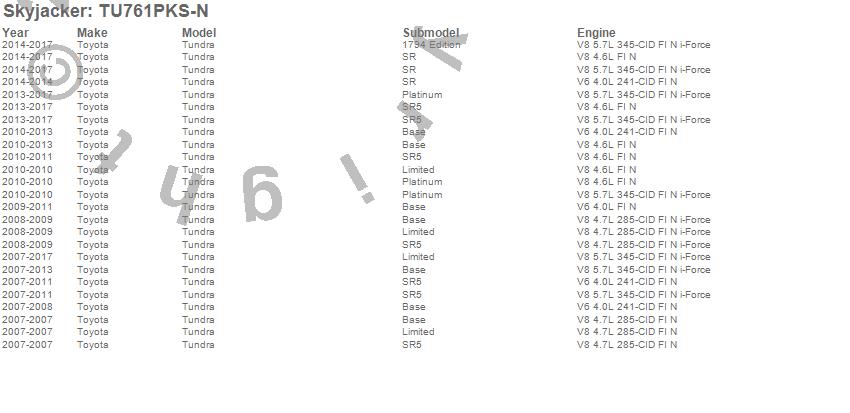Brand: SkyjackerPart Number: TU761PKS-NLift Kit-Suspension w/Shock Type: Nitro Shocks - 6 in. Lift - Incl. Knuckles Pair - Front/Rear Crossmembers - Rear Springs - BrakelinesUPC: