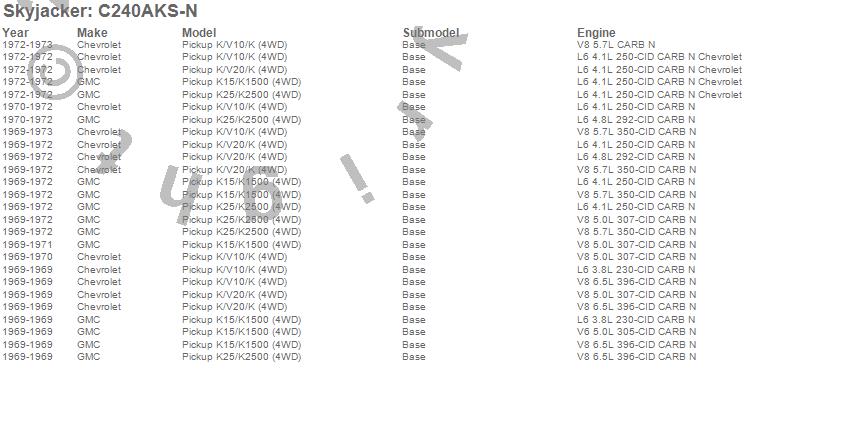 Below is an abbreviated list of applications for the Suspension Lift Kit w/Shock.K10 Pickup, K15/K1500 Pickup, K20 Pickup, K25/K2500 Pickup, Chevrolet, GMC, 1972, 1971, 1970, 1969