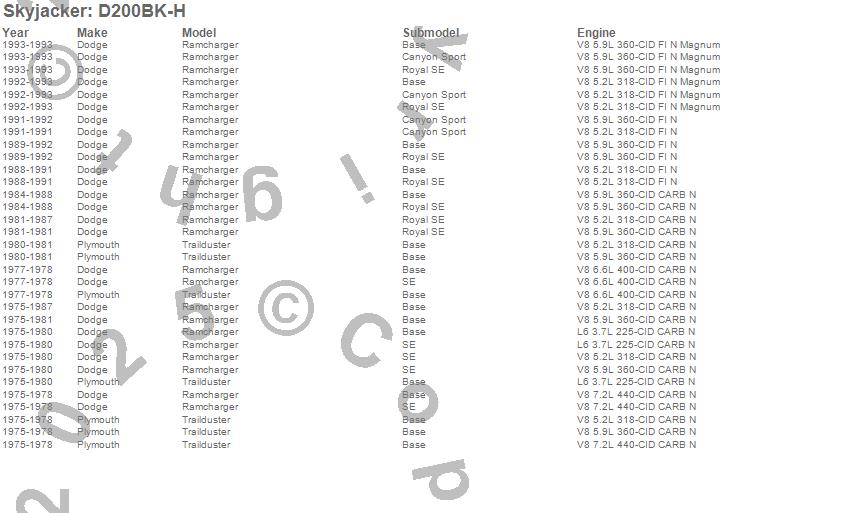 Below is an abbreviated list of applications for the Suspension Lift Kit w/Shock.Ramcharger, Trailduster, Dodge, Plymouth, 1993, 1992, 1991, 1990, 1989, 1988, 1987, 1986, 1985, 1984, 1983, 1982, 1981, 1980, 1979, 1978