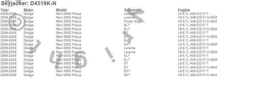 Below is an abbreviated list of applications for the Suspension Lift Kit w/Shock.Ram 2500 Pickup, Ram 3500 Pickup, Dodge, 2009, 2008, 2007, 2006