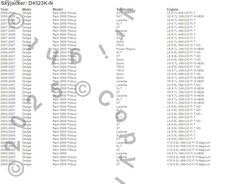 Below is an abbreviated list of applications for the Suspension Lift Kit w/Shock.Ram 2500 Pickup, Ram 3500 Pickup, Dodge, 2008, 2007, 2006, 2005, 2004, 2003