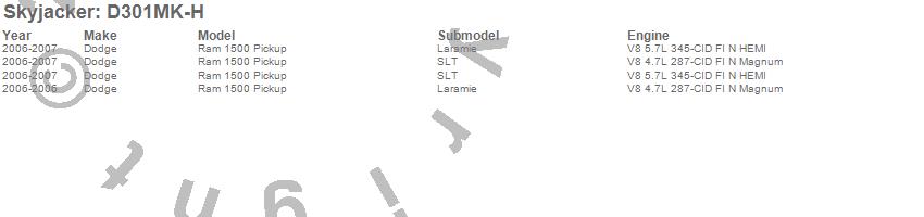 Brand: SkyjackerPart Number: D301MK-HLift Kit-Suspension w/Shock Type: Hydro Shocks - 2.5-3.5 in. Lift - Incl. Front Springs - Add-A-LeafsUPC: