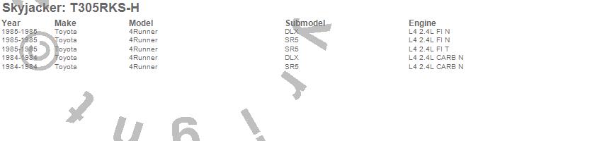 Brand: SkyjackerPart Number: T305RKS-HLift Kit-Suspension w/Shock Type: Hydro Shocks - 5 in. Lift - Incl. Front/Rear Leaf Springs - Front/Rear UBolt Kits - Front/Rear Spring Bushing Kits - Track Arm BracketUPC: