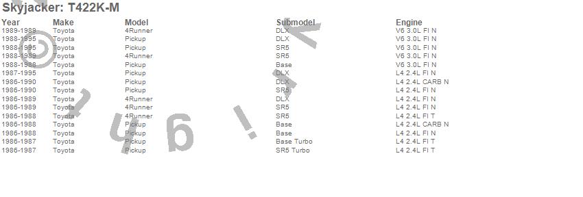 Brand: SkyjackerPart Number: T422K-MLift Kit-Suspension w/Shock Type: M95 Performance Shocks - 4 in. Lift - Incl. Spindles - SkidPlate/Diff/SwayBarBrkts - A-ArmXMember - BumpStopSpacer - RrUBoltKit - RrSpringBushingsUPC: