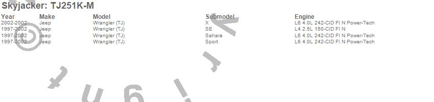 Brand: SkyjackerPart Number: TJ251K-MLift Kit-Suspension w/Shock Type: M95 Performance Shocks - 2.5 in. Lift - Incl. Front/Rear Coil Springs - Lower Links - Bump Stops - Transfer Case Lowering KitUPC: