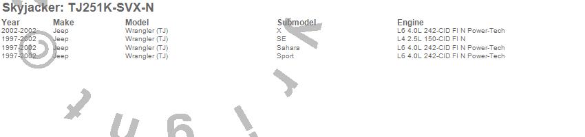 Brand: SkyjackerPart Number: TJ251K-SVX-NLift Kit-Suspension w/Shock Type: Nitro Shocks - 2.5 in. Lift - Incl. Fr/RrCoilSpring - LowerLink - SkidPlate - TrnsfrCaseLwringKit - SwayBarLink - RrTrackBarReloBrktUPC: