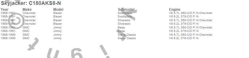 Brand: SkyjackerPart Number: C180AKS8-NLift Kit-Suspension w/Shock Type: Nitro Shocks - 8 in. Lift - Incl. Front/Rear Leaf Springs - Front/Rear UBolt Kits - Bushing Kit - Brake Line BracketsUPC: