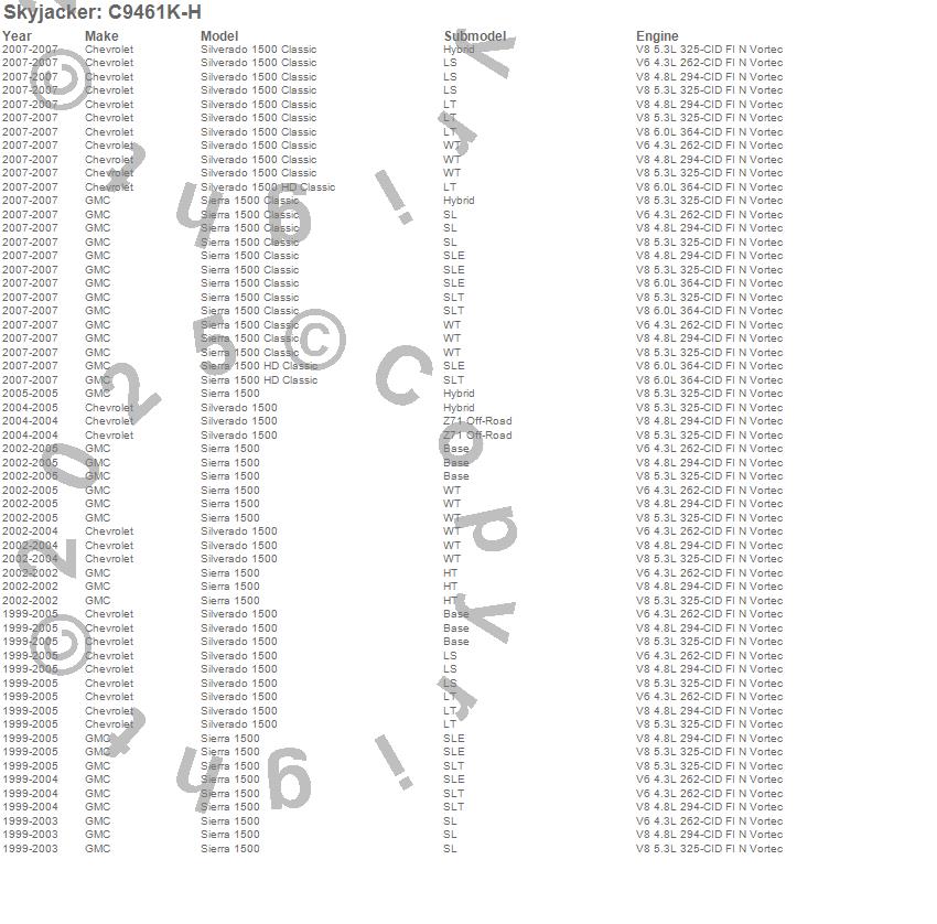 Brand: SkyjackerPart Number: C9461K-HLift Kit-Suspension w/Shock Type: Hydro Shocks - 3 in. Lift - Incl. Component Box PN[C9331/BUK2063]UPC: