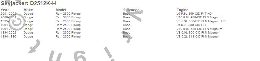 Brand: SkyjackerPart Number: D2512K-HLift Kit-Suspension w/Shock Type: Hydro Shocks - 2-2.5 in. Lift - Incl. Front Coil Spring - Rear Add-A-Leafs - Lower Links - Bump StopsUPC: