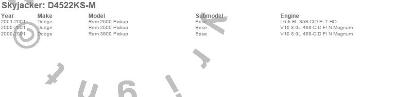 Brand: SkyjackerPart Number: D4522KS-MLift Kit-Suspension w/Shock Type: M95 Performance Shocks - 4-4.5 in. Lift - Incl. Fr Coil/Rr Leaf Springs - Pitman Arm - Bump Stops - Rr UBolts - Vent Hose - Steering Stab. - Dual Shock BrktUPC: