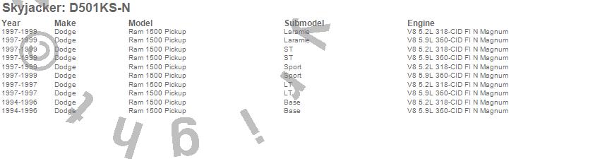 Brand: SkyjackerPart Number: D501KS-NLift Kit-Suspension w/Shock Type: Nitro Shocks - 5 in. Lift - Incl. Fr Cl/Rr Lf Sprngs - Upr/Lwr Lnks - Swy Br Brkt - Ptmn Arm - Bmp Stps - Rr UBlt Kit - Steering StabUPC: