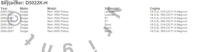 Brand: SkyjackerPart Number: D5022K-HLift Kit-Suspension w/Shock Type: Hydro Shocks - 5 in. Lift - InclFrClSprng - Upr/Lwr Lnk - PtmnArm - BmpStp - Rr AddALeaf - RrUBlt - Skd Plt - StrStb. - DlShckBrktUPC: