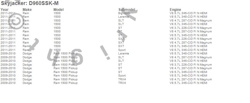 Brand: SkyjackerPart Number: D960SSK-MLift Kit-Suspension w/Shock Type: M95 Performance Shocks - 6 in. Lift - Incl. Frt Strut Spacers/Steering Knuckles - Frt/Rr XMember - Diff Relo Brkts/Skid Plate - Rr Control Arm Relo BrktsUPC:
