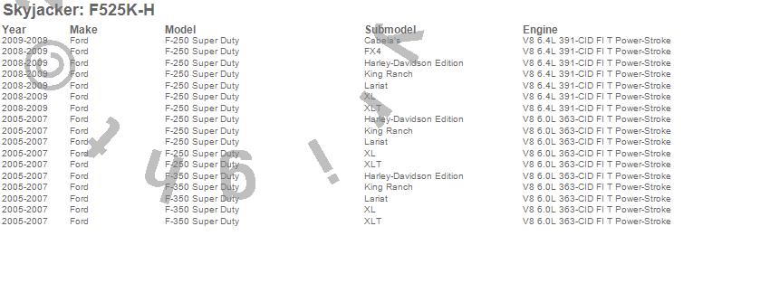 Brand: SkyjackerPart Number: F525K-HLift Kit-Suspension w/Shock Type: Hydro Shocks - 2-2.5 in. Lift - Incl. Front Coil Springs - Rear Add-A-LeafsUPC: