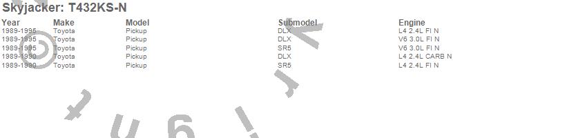 Brand: SkyjackerPart Number: T432KS-NLift Kit-Suspension w/Shock Type: Nitro Shocks - 4 in. Lift - Incl. RrLeafSprings - Spindles - SkidPlate/SwayArm/DiffBrkts - AArmXMember - BumpStop - RrUBoltKit - RrBlockUPC:
