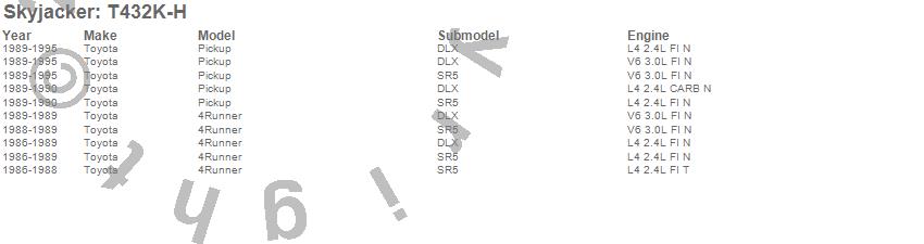 Brand: SkyjackerPart Number: T432K-HLift Kit-Suspension w/Shock Type: Hydro Shocks - 4 in. Lift - Incl. Spindles - Skid Plate Brkt - A-Arm Cross Member - Diff Brkt - Sway Bar Brkt - Bump Stops - Fr UBolt Kit - Rr BlockUPC: