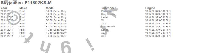 Below is an abbreviated list of applications for the Suspension Lift Kit w/Shock.F-250 Super Duty Pickup, F-350 Super Duty Pickup, Ford, 2012, 2011