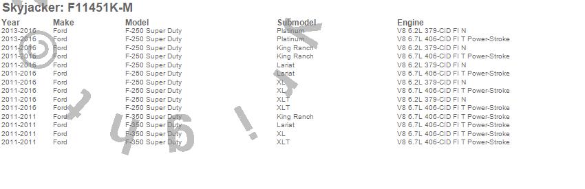 Below is an abbreviated list of applications for the Suspension Lift Kit w/Shock.F-250 Super Duty Pickup, F-350 Super Duty Pickup, Ford, 2012, 2011