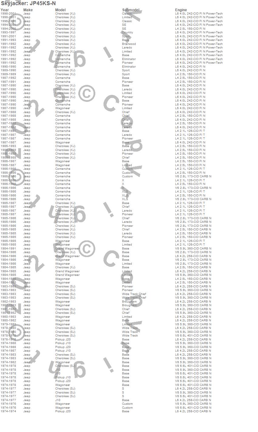 Brand: SkyjackerPart Number: JP45KS-NLift Kit-Suspension w/Shock Type: Nitro Shocks - 3.5-4 in. Lift - Incl. Frnt/Rear Leaf Springs - Frnt Bushing Kit - Track Bar Relocation Bracket - Frnt/Rear UBolt KitUPC:
