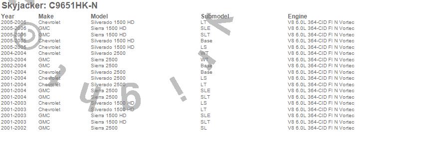 Brand: SkyjackerPart Number: C9651HK-NLift Kit-Suspension w/Shock Type: Nitro Shocks - 6 in. Lift - Incl. CrossMembers - DiffDropBracket - CVSpacer - RearBlock - UBolt - Knuckles - SkidPlates - TorsionBarDropBracketUPC: