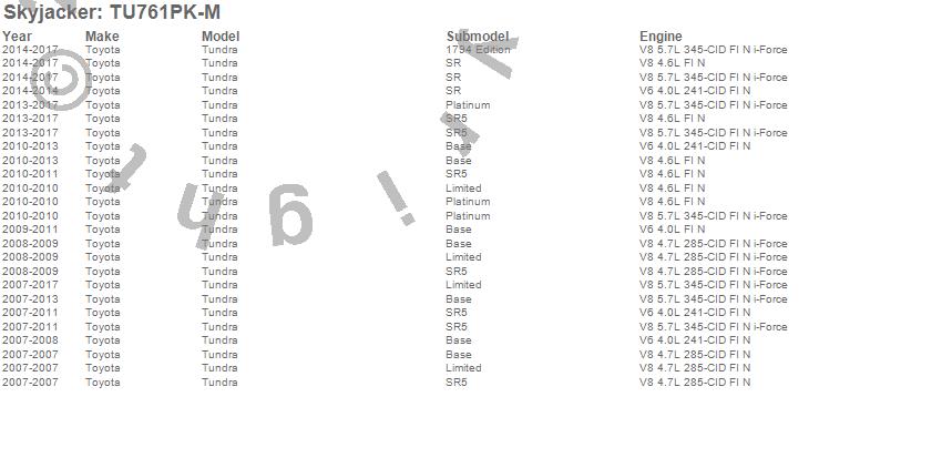 Brand: SkyjackerPart Number: TU761PK-MLift Kit-Suspension w/Shock Type: M95 Performance Shocks - 6 in. Lift - Incl. Knuckles Pair - Front/Rear Crossmembers - Rear Blocks - BrakelinesUPC:
