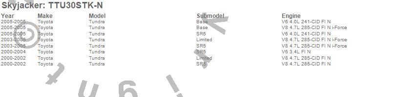 Brand: SkyjackerPart Number: TTU30STK-NLift Kit-Suspension w/Shock Type: Nitro Shocks - 3 in. Lift - Incl. Main Component Box - Rear Add-A-LeafUPC: