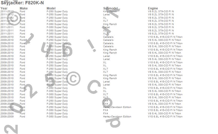 Below is an abbreviated list of applications for the Suspension Lift Kit w/Shock.F-250 Super Duty Pickup, F-350 Super Duty Pickup, Ford, 2012, 2011, 2010, 2009, 2008