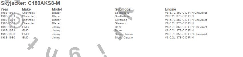 Brand: SkyjackerPart Number: C180AKS8-MLift Kit-Suspension w/Shock Type: M95 Performance Shocks - 8 in. Lift - Incl. Front/Rear Leaf Springs - Front/Rear UBolt Kits - Bushing Kit - Brake Line BracketsUPC:
