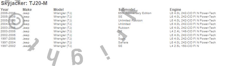Brand: SkyjackerPart Number: TJ20-MLift Kit-Suspension w/Shock Type: M95 Performance Shocks - 2 in. Lift - Incl. Poly Spacer - Blocks w/BoltsUPC: