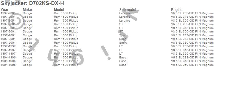 Brand: SkyjackerPart Number: D702KS-DX-HLift Kit-Suspension w/Shock Type: Hydro Shocks - 7 in. Lift - Incl Fr Coil/Rr Leaf Spring - UBolt Kit - Dual Shock Brkt - Skid Plate - Steering Stab. - Cross Member - Indexing RingUPC: