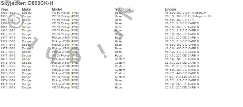 Brand: SkyjackerPart Number: D600CK-HLift Kit-Suspension w/Shock Type: Hydro Shocks - 5-6 in. Lift - Incl. Front Leaf Springs - Front/Rear UBolt Kits - Front Bushing Kit - Rear BlockUPC: