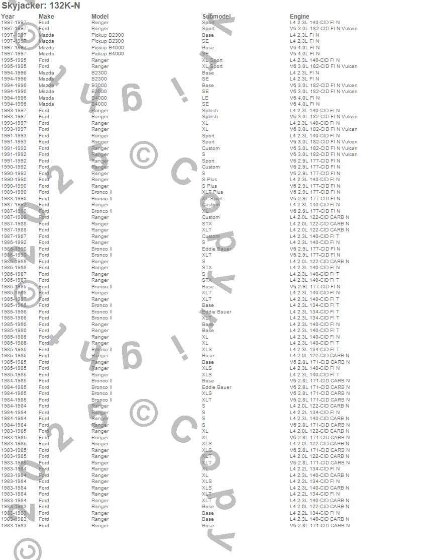 Below is an abbreviated list of applications for the Suspension Lift Kit w/Shock.B2300, B3000, B4000, Bronco II, Ranger, Ford, Mazda, 1997, 1996, 1995, 1994, 1993, 1992, 1991, 1990, 1989, 1988, 1987, 1986, 1985