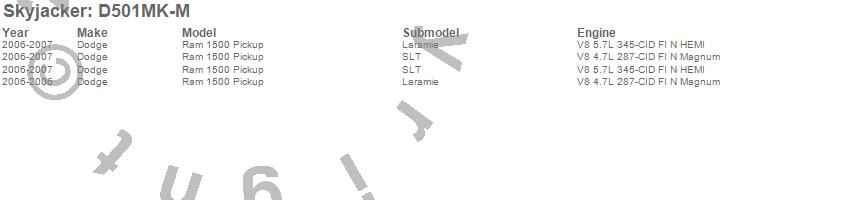 Brand: SkyjackerPart Number: D501MK-MLift Kit-Suspension w/Shock Type: M95 Performance Shocks - 4.5-5.5 in. Lift - Incl. Front Springs - Add-A-Leafs - Steering Correction - Steering StabilizerUPC: