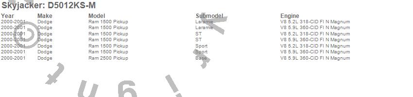 Brand: SkyjackerPart Number: D5012KS-MLift Kit-Suspension w/Shock Type: M95 Performance Shocks - 5 in. Lift - Incl. Front Coil Springs - Rear Leaf Springs - Upper/Lower Links - Brkts - Pitman Arm - Bump StopsUPC: