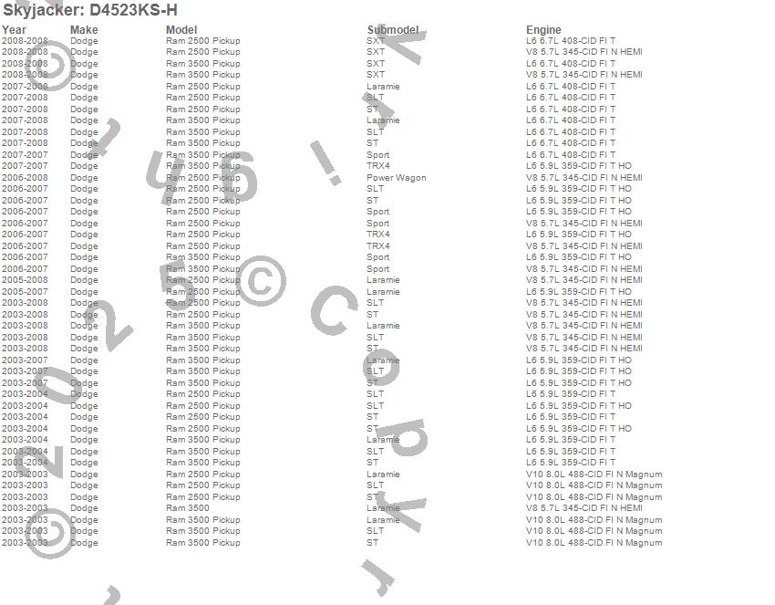 Below is an abbreviated list of applications for the Suspension Lift Kit w/Shock.Ram 2500 Pickup, Ram 3500 Pickup, Dodge, 2008, 2007, 2006, 2005, 2004, 2003