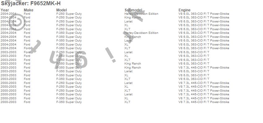 Brand: SkyjackerPart Number: F9652MK-HLift Kit-Suspension w/Shock Type: Hydro Shocks - 6 in. Lift - Incl. Fr Leaf Springs - Track Bar Brkts - Fr/Rr UBolt Kits - Spring Bushings - Rr Block - Sway Bar End LinksUPC: