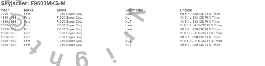 Brand: SkyjackerPart Number: F9603MKS-MLift Kit-Suspension w/Shock Type: M95 Performance Shocks - 6 in. Lift - Incl. Fr/Rr Leaf Springs - Track Bar Brkts - Front/Rear UBolt Kits - Spring Bushing Kit - Sway Bar LinksUPC: