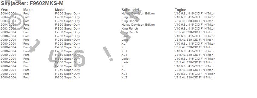 Brand: SkyjackerPart Number: F9602MKS-MLift Kit-Suspension w/Shock Type: M95 Performance Shocks - 6 in. Lift - Incl. Fr/Rr Leaf Springs - Track Bar Brkts - Fr/Rr UBolt Kits - Spring Bushings - Sway Bar LinksUPC:
